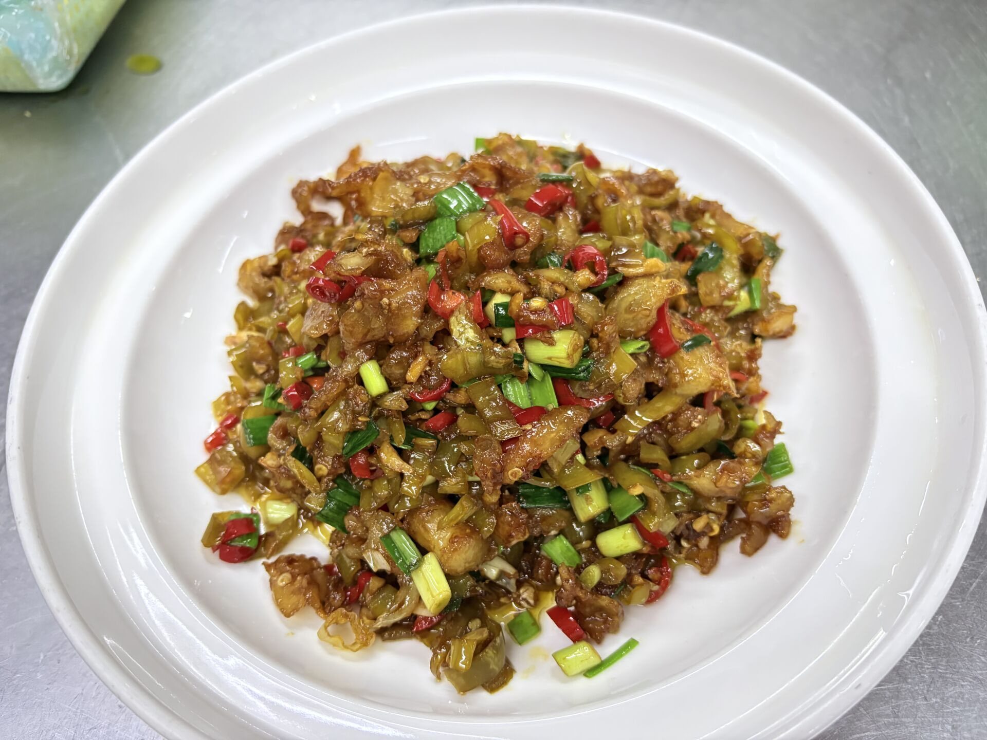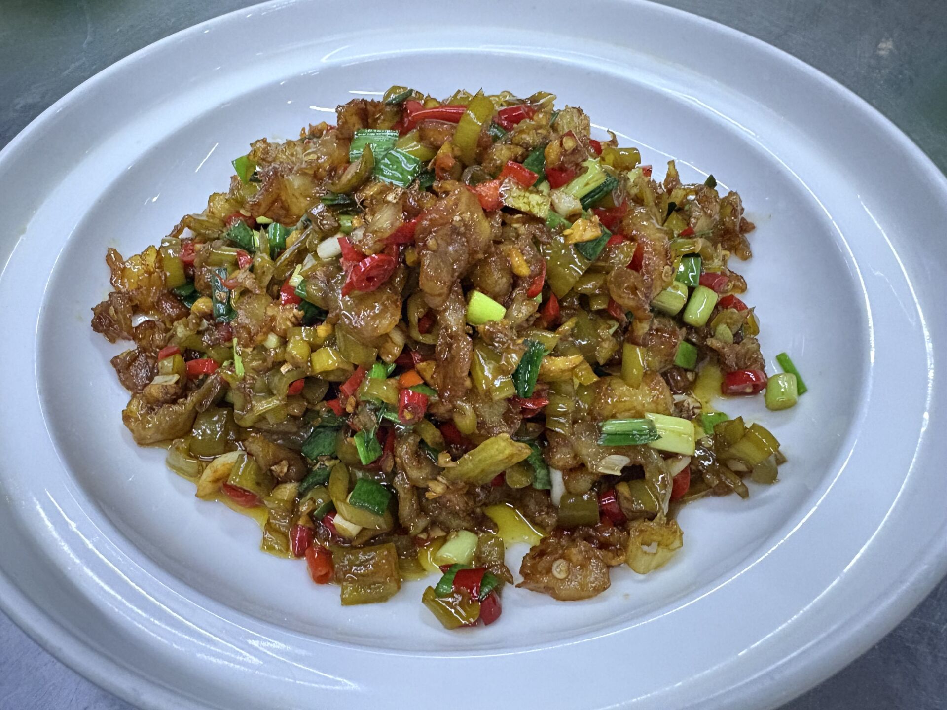 湖湘泡辣椒开坛!爆炒牛蹄筋出品:曾厨 / 日期:2025-08-30青线椒洗净晾干水分装坛,放入香料八角、桂皮、花椒,盐,啤酒;封坛一周,取出辣椒滤干水开边切碎。牛蹄筋放入姜片,香料八角、桂皮、香叶,黄干椒,盐,高压锅压制软烂;挑出牛蹄筋。泡好的辣椒200克,牛蹄筋150克,大蒜叶30克,小米椒30克,野山椒10克,蒜米10克;泡青椒炒稍微干水分备用,菜籽油猪油烧热,下入牛蹄筋爆香,下入蒜米、野山椒、小米椒炒香,调味:味精、蚝油、酱油,炒匀,下入泡青椒、大蒜叶,爆炒出香味出锅。0